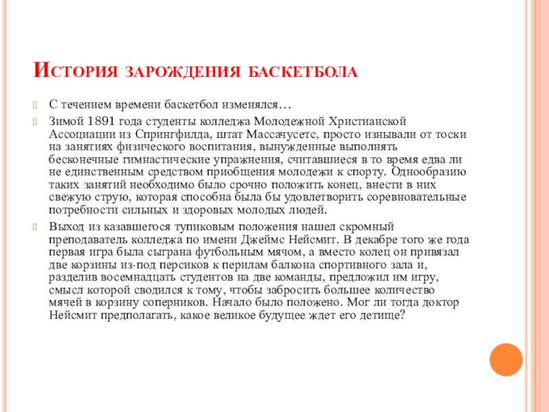 Молодежной Христианской Ассоциации из Спрингфилда, штат Массачусетс, просто изнывали от тоски на занятиях физического воспитания, вынужденные выполнять бесконечные гимнастические упражнения, считавшиеся в то время едва ли не единственным средством приобщения молодежи к спорту. Однообразию таких занятий необходимо было срочно положить конец, внести в них свежую струю, которая способна была бы удовлетворить соревновательные потребности сильных и здоровых молодых людей.