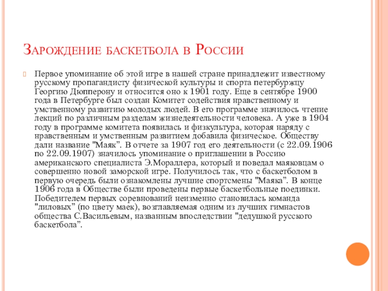 принадлежит известному русскому пропагандисту физической культуры и спорта петербуржцу Георгию Дюпперону и относится оно к 1901 году. Еще в сентябре 1900 года в Петербурге был создан Комитет содействия нравственному и умственному развитию молодых людей. В его программе значилось чтение лекций по различным разделам жизнедеятельности человека. А уже в 1904 году в программе комитета появилась и физкультура, которая наряду с нравственным и умственным развитием добавила физическое. Обществу дали название "Маяк”. В отчете за 1907 год его деятельности (с 22.09.1906 по 22.09.1907) значилось упоминание о приглашении в Россию американского специалиста Э.Мораллера, который и поведал маяковцам о совершенно новой заморской игре. Получилось так, что с баскетболом в первую очередь были ознакомлены лучшие спортсмены "Маяка”. В конце 1906 года в Обществе были проведены первые баскетбольные поединки. Победителем первых соревнований неизменно становилась команда "лиловых” (по цвету маек), возглавляемая одним из лучших гимнастов общества С.Васильевым, названным впоследствии "дедушкой русского баскетбола”.
