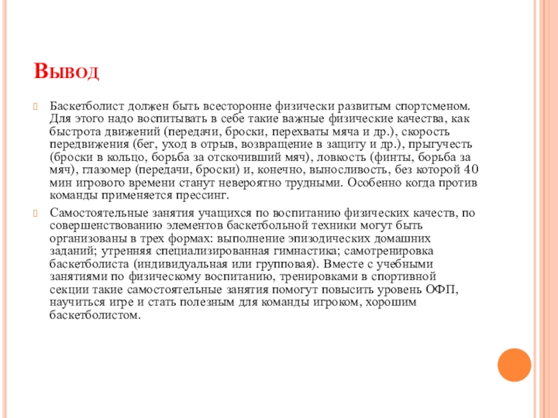 Баскетболист должен быть всесторонне физически развитым спортсменом. Для этого надо воспитывать