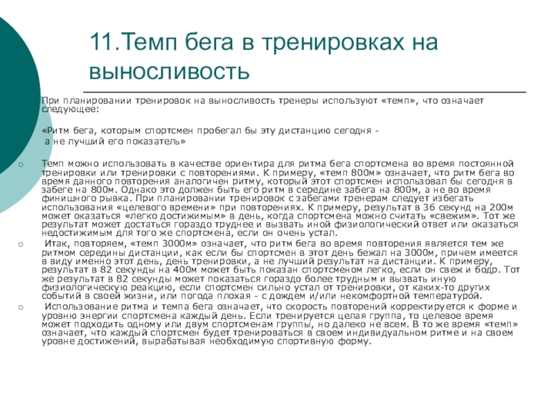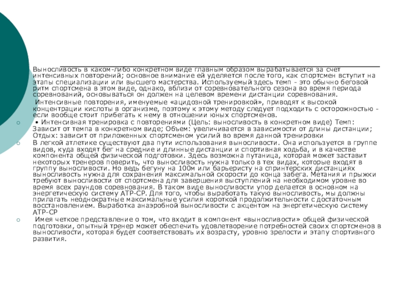 повторений; основное внимание ей уделяется после того, как спортсмен вступит на этапы специализации или высшего мастерства. Используемый здесь темп - это обычно беговой ритм спортсмена в этом виде, однако, вблизи от соревновательного сезона во время периода соревнований, основываться он должен на целевом времени дистанции соревнования.