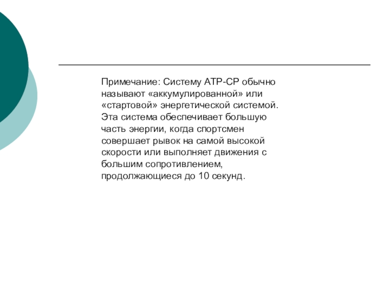 Слайд 23Примечание: Систему АТР-СР обычно называют «аккумулированной» или «стартовой» энергетической системой. Эта
