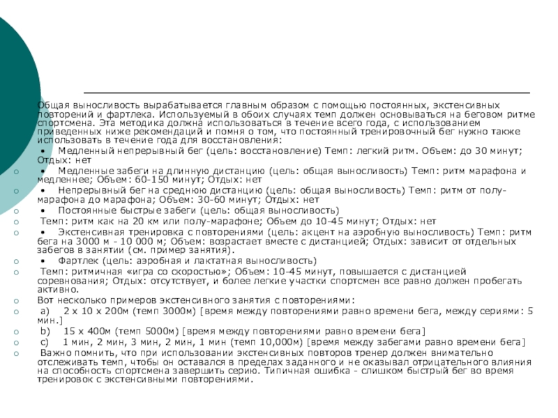 • Экстенсивная тренировка с повторениями (цель: акцент на аэробную выносливость) Темп: ритм бега на 3000 м - 10 000 м; Объем: возрастает вместе с дистанцией; Отдых: зависит от отдельных забегов в занятии (см. пример занятия).