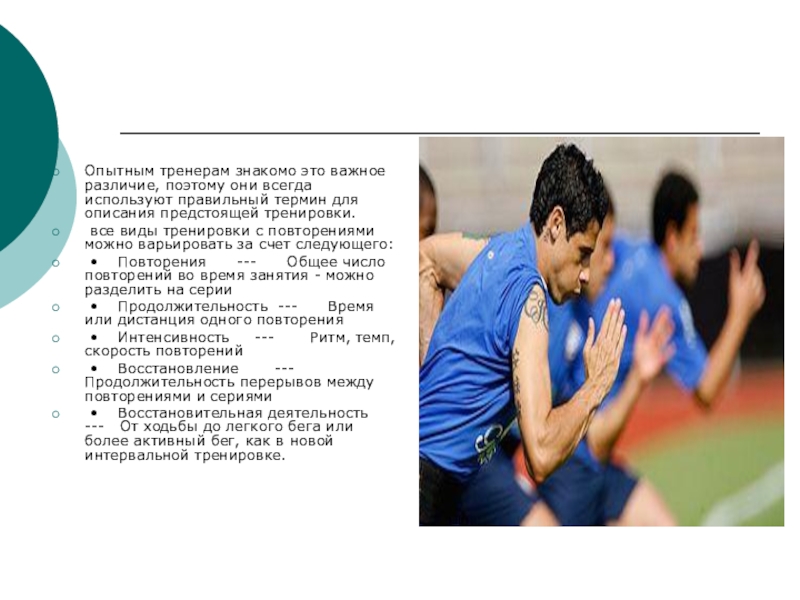 Итак, термин «интервальная тренировка» следует использовать в отношении специальной тренировки с повторениями, где тренировочный эффект достигается в промежутке между более быстрыми отрезками.
