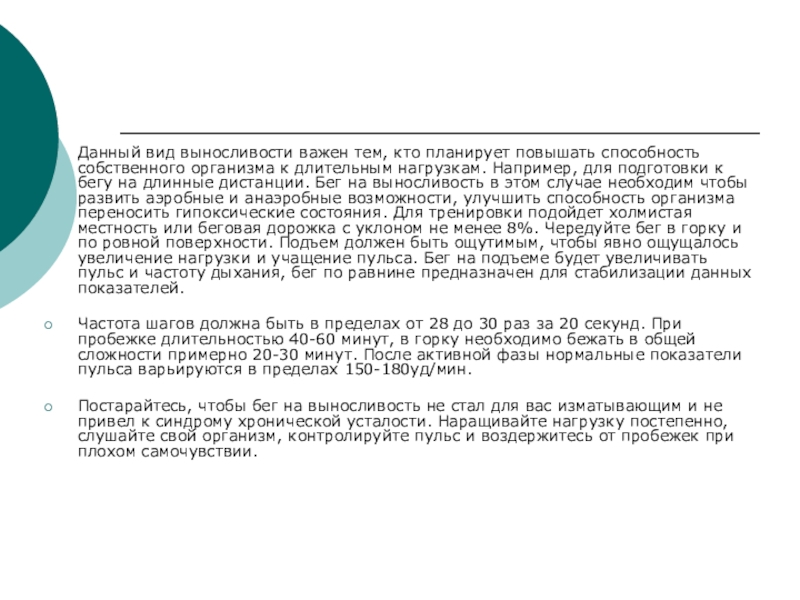 к длительным нагрузкам. Например, для подготовки к бегу на длинные дистанции. Бег на выносливость в этом случае необходим чтобы развить аэробные и анаэробные возможности, улучшить способность организма переносить гипоксические состояния. Для тренировки подойдет холмистая местность или беговая дорожка с уклоном не менее 8%. Чередуйте бег в горку и по ровной поверхности. Подъем должен быть ощутимым, чтобы явно ощущалось увеличение нагрузки и учащение пульса. Бег на подъеме будет увеличивать пульс и частоту дыхания, бег по равнине предназначен для стабилизации данных показателей.