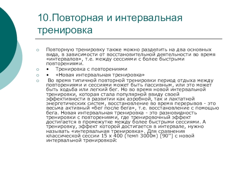виды повторной тренировки являются интервальными. 15 x 400 (темп 5000м) [100м бега после бега] или