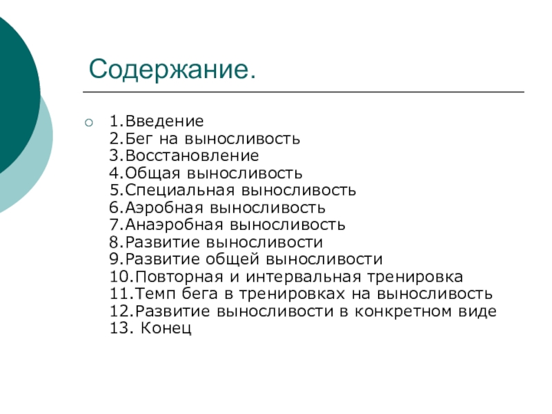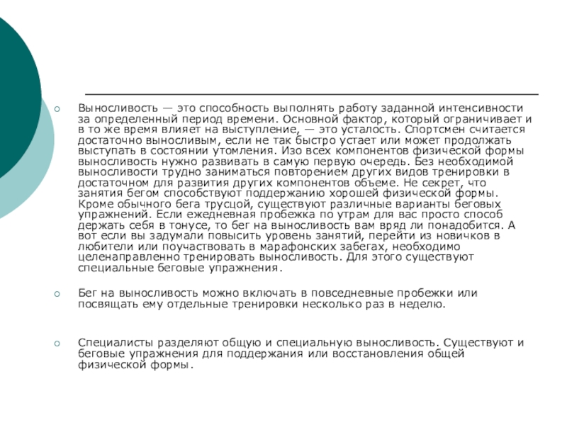 времени. Основной фактор, который ограничивает и в то же время влияет на выступление, — это усталость. Спортсмен считается достаточно выносливым, если не так быстро устает или может продолжать выступать в состоянии утомления. Изо всех компонентов физической формы выносливость нужно развивать в самую первую очередь. Без необходимой выносливости трудно заниматься повторением других видов тренировки в достаточном для развития других компонентов объеме. Не секрет, что занятия бегом способствуют поддержанию хорошей физической формы. Кроме обычного бега трусцой, существуют различные варианты беговых упражнений. Если ежедневная пробежка по утрам для вас просто способ держать себя в тонусе, то бег на выносливость вам вряд ли понадобится. А вот если вы задумали повысить уровень занятий, перейти из новичков в любители или поучаствовать в марафонских забегах, необходимо целенаправленно тренировать выносливость. Для этого существуют специальные беговые упражнения.