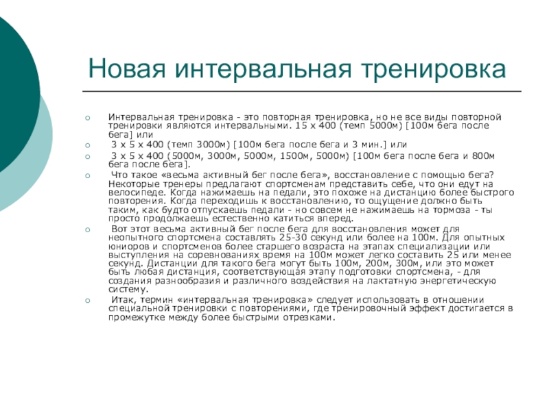 Во время типичной повторной тренировки период отдыха между повторениями и сессиями может быть пассивным, или это может быть ходьба или легкий бег. Но во время новой интервальной тренировки, которая стала популярной ввиду своей эффективности в развитии как аэробной, так и лактатной энергетических систем, восстановление во время перерывов - это весьма активный «бег после бега», т.е. восстановление с помощью бега. Новая интервальная тренировка - это разновидность тренировки с повторениями, где тренировочный эффект достигается в промежутке между более быстрыми сессиями. А тренировку, эффект которой достигается в интервале, нужно называть «интервальная тренировка». Для сравнения классической сессии 15 х 400 (темп 3000м) [90''] с новой интервальной тренировкой: