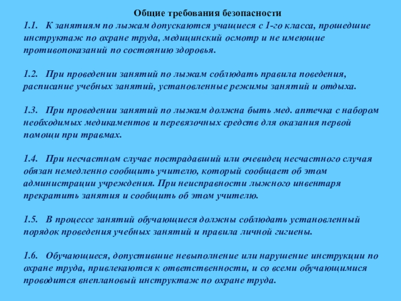 1. Соблюдать интервал при движении на лыжах по дистанции 3-4 м, при спусках с горы - не менее 30 м. На небольших горках пока первый не отойдёт от подножия горы, второй не имеет право выполнять спуск.
