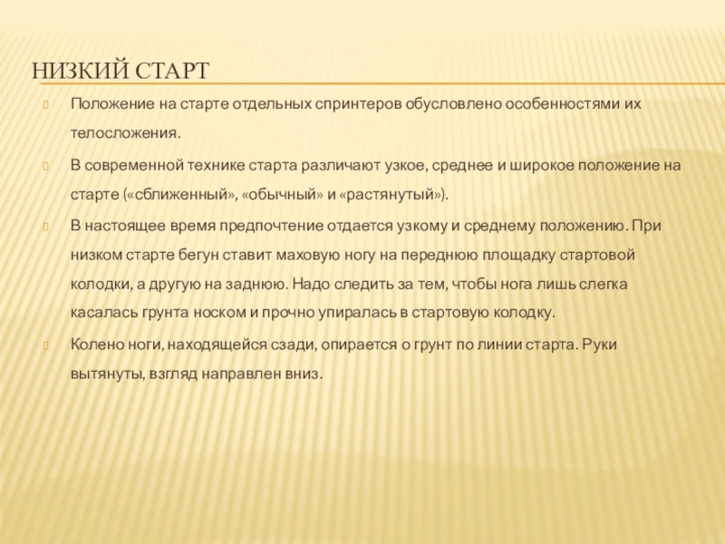 В настоящее время предпочтение отдается узкому и среднему положению. При низком старте бегун ставит маховую ногу на переднюю площадку стартовой колодки, а другую на заднюю. Надо следить за тем, чтобы нога лишь слегка касалась грунта носком и прочно упиралась в стартовую колодку.