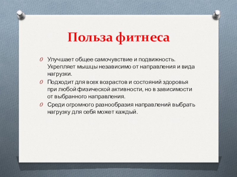 Польза фитнесаУлучшает общее самочувствие и подвижность. Укрепляет мышцы независимо от направления и вида нагрузки. Подходит для всех