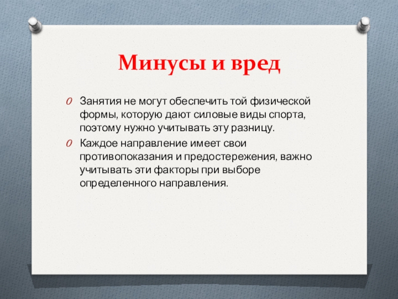 Минусы и вредЗанятия не могут обеспечить той физической формы, которую дают силовые виды спорта, поэтому нужно учитывать