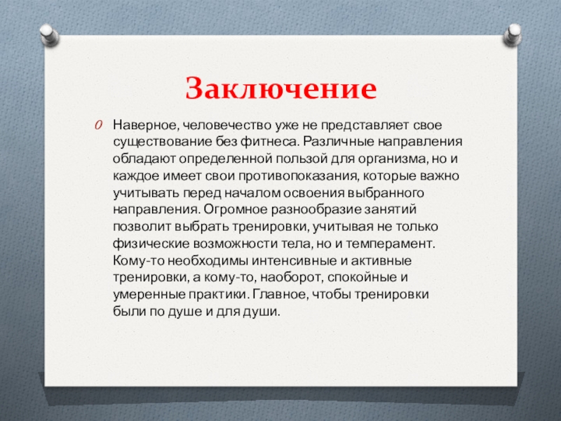ЗаключениеНаверное, человечество уже не представляет свое существование без фитнеса. Различные направления обладают определенной пользой для организма, но