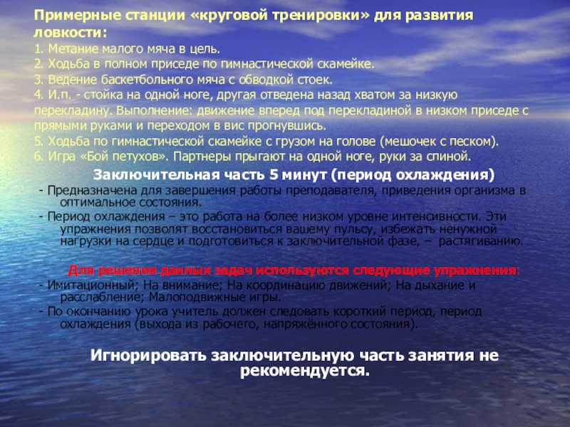 - Предназначена для завершения работы преподавателя, приведения организма в оптимальное состояния.