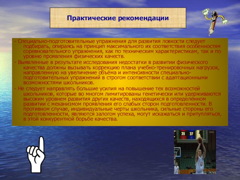 - Не следует направлять большие усилия на повышение тех возможностей школьников, которые во многом лимитированы генетически или удерживаются высоким уровнем развития других качеств, находящихся в определённом развитии с механизмом проявления его слабых сторон подготовленности. В противном случае, индивидуальные черты школьника, сильные стороны его подготовленности, являются залогом успеха, могут искажаться и притупляться, в этой конкурентной борьбе качества.