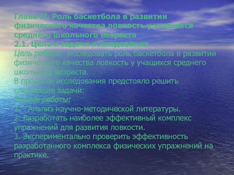 Слайд 10Глава II. Роль баскетбола в развитии физического качества ловкость у учащихся