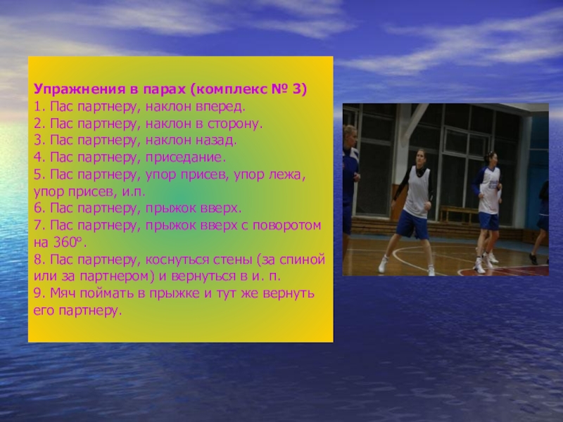 23. Прыжки через длинную скакалку в парах с передачами мяча.