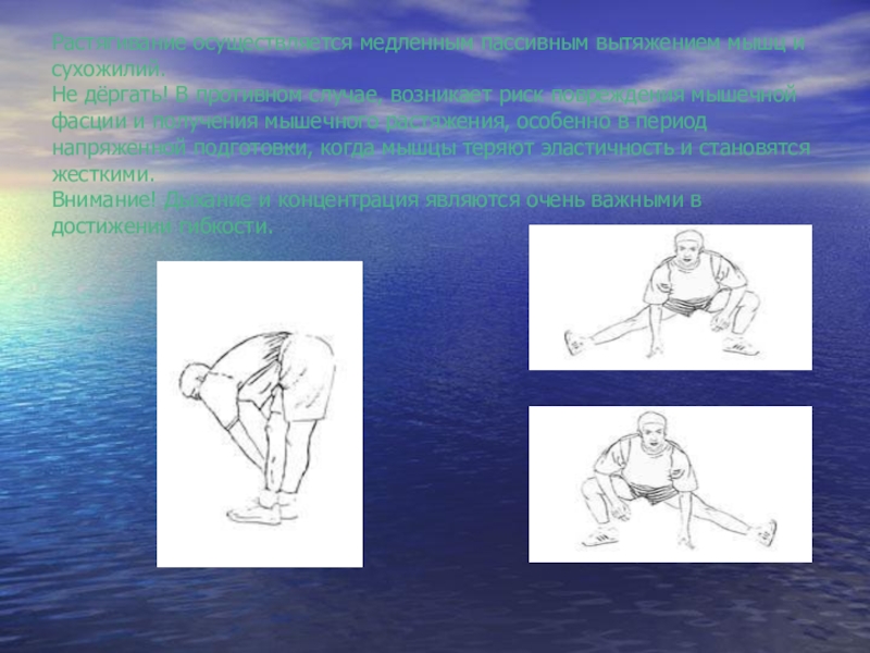 При растягивании, дышите медленно и ритмично. Выдыхайте в начале движения, затем,