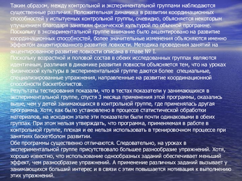 динамика в развитии координационных способностей у испытуемых контрольной группы, очевидно, объясняется некоторым улучшением благодаря занятиям физической культурой по обычной программе. Поскольку в экспериментальной группе внимание было акцентировано на развитие координационных способностей, более значительные изменения объясняются именно эффектом акцентированного развития ловкости. Методика проведения занятий на акцентированное развитие ловкости описана в главе № I.