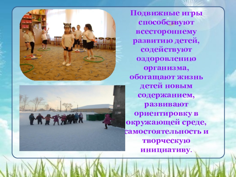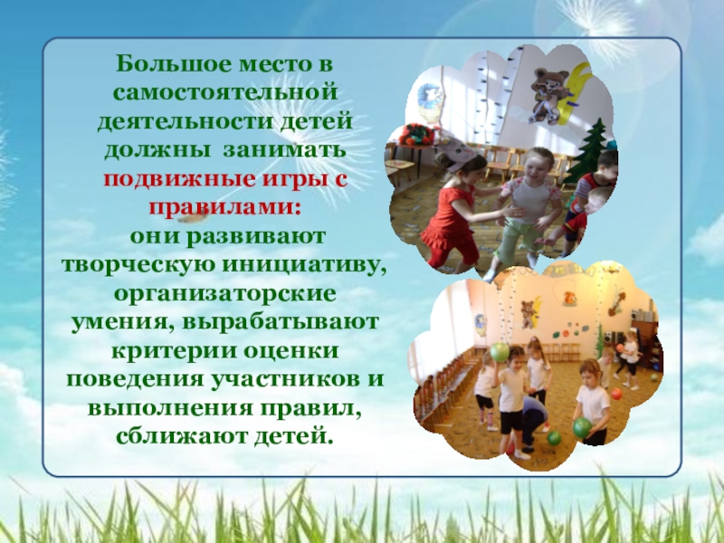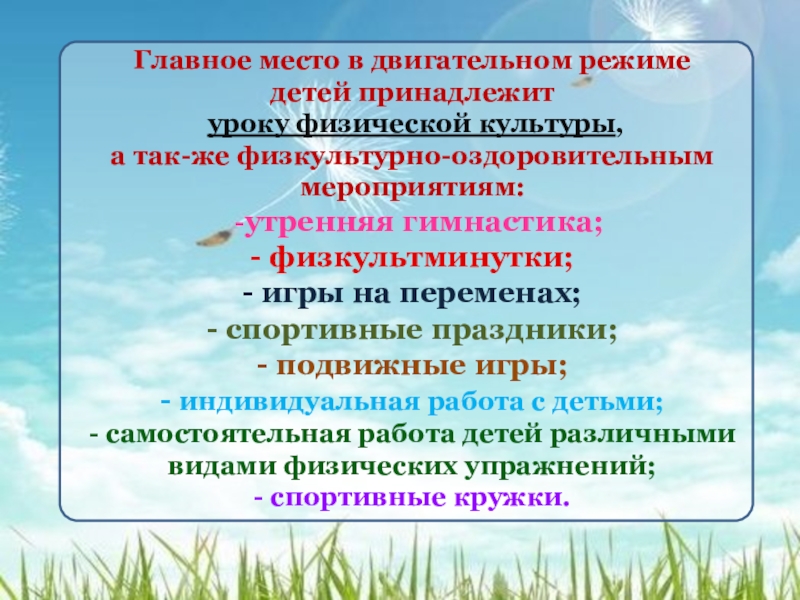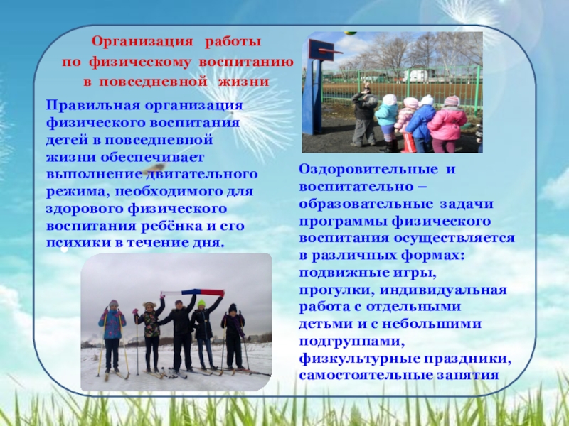 Оздоровительные и воспитательно – образовательные задачи программы физического воспитания осуществляется в различных формах: подвижные игры, прогулки, индивидуальная работа с отдельными детьми и с небольшими подгруппами, физкультурные праздники, самостоятельные занятия