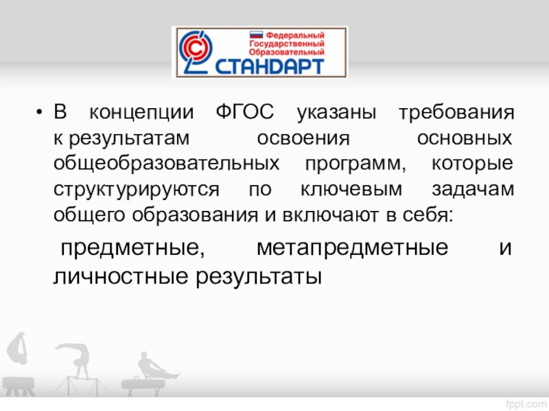 Слайд 2В концепции ФГОС указаны требования к результатам освоения основных общеобразовательных программ, которые