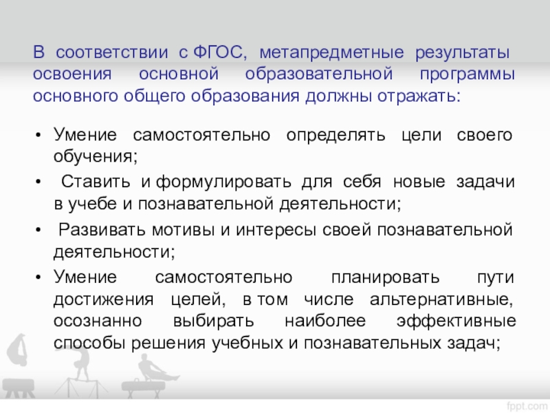 Слайд 12В соответствии с ФГОС, метапредметные результаты освоения основной образовательной программы основного общего