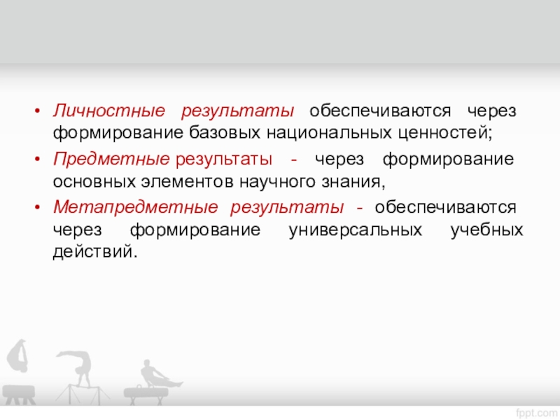 Слайд 4Личностные результаты обеспечиваются через формирование базовых национальных ценностей;