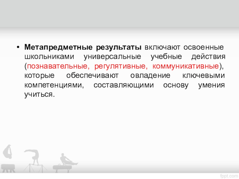 Слайд 5Метапредметные результаты включают освоенные школьниками универсальные учебные действия (познавательные, регулятивные, коммуникативные),