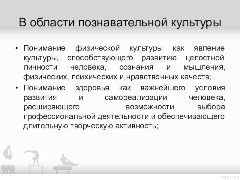 Понимание здоровья как важнейшего условия развития и самореализации человека, расширяющего возможности выбора профессиональной деятельности и обеспечивающего длительную творческую активность;
