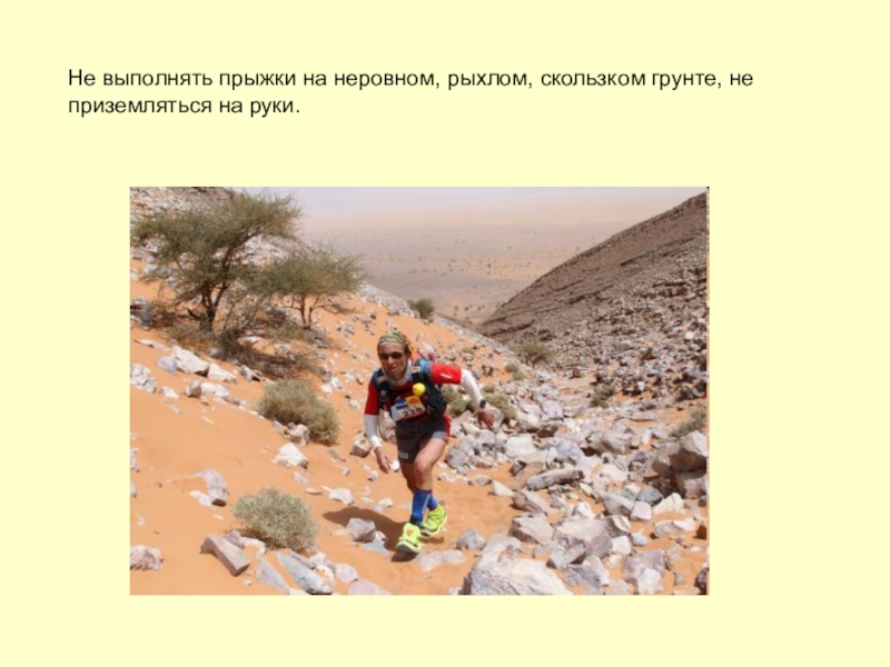 Слайд 8Не выполнять прыжки на неровном, рыхлом, скользком грунте, не приземляться на