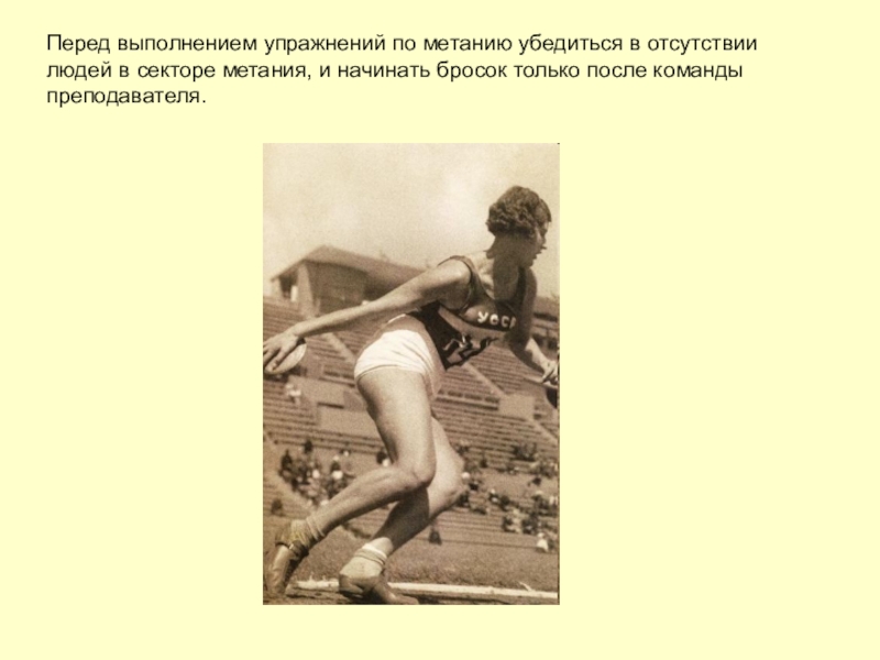 Слайд 9Перед выполнением упражнений по метанию убедиться в отсутствии людей в секторе