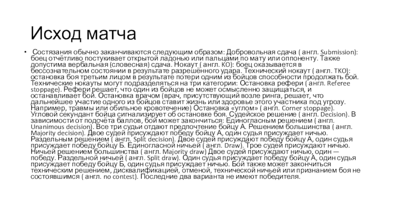 время которых бойцы экономили энергию. Бои без ограничения во времени также затрудняли трансляцию по телевидению в прямом эфире. В большинстве профессиональных организаций обычные бои длятся три раунда по пять минут, в то время как в титульных боях количество раундов увеличивается до пяти. Также следует отметить различие в принципиальном подходе к правилам в разных странах: так, в США бои ММА строго регулируются атлетическими комиссиями штатов, в результате чего бойцы более ограничены в приёмах, в то время как в Европе и Азии правила, преимущественно, более свободные. Например, во многих штатах США в любительском ММА запрещено наносить удары локтями. Удары локтями сверху вниз, в английском языке называемые «12-6» («двенадцать-шесть»), вообще запрещены многими профессиональными организациями, в частности, UFC. Также во многих организациях наложены ограничения на удары коленом в партере: в данном вопросе наиболее фривольной являлась ныне несуществующая японская организация Pride Fighting Championships, где разрешалось наносить удары коленями и ногами по голове лежащего противника (т. н. «футбольные удары»). Также варьируется легальность таких приемов, как удары головой и болевые на позвоночник (напр., «гильотина», «распятие»), однако, несмотря на различия, приёмами, запрещёнными практически во всех официальных организациях, на сегодня являются: укусы, удары в пах, горло, по затылку и позвоночнику, тычки в глаза, захват и манипулирование малыми суставами (например, пальцами рук) «рыболовные крючки» ( англ. fish-hooking) (атака пальцами незащищённых мест, например, уши, рот, ноздри с намерением разорвать ткани)