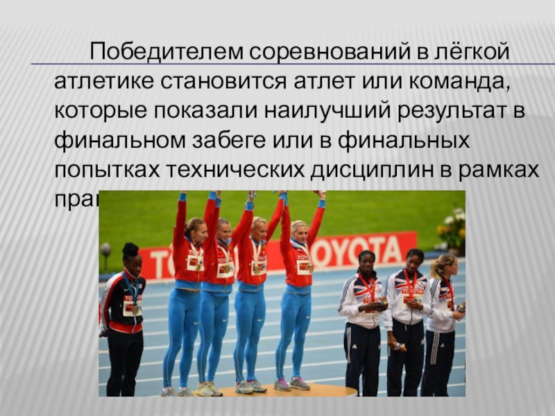 Слайд 11 Победителем соревнований в лёгкой атлетике становится атлет или команда, которые показали