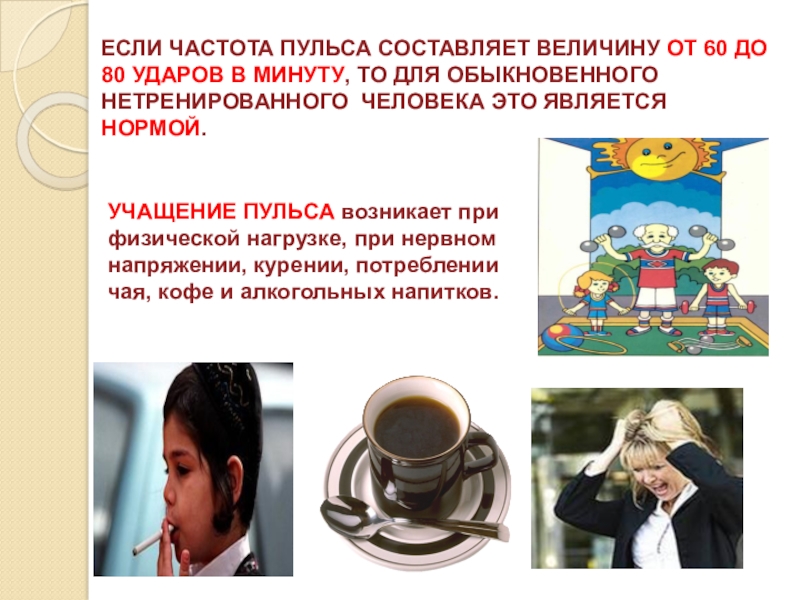 УЧАЩЕНИЕ ПУЛЬСА возникает при физической нагрузке, при нервном напряжении, курении, потреблении чая, кофе и алкогольных напитков.