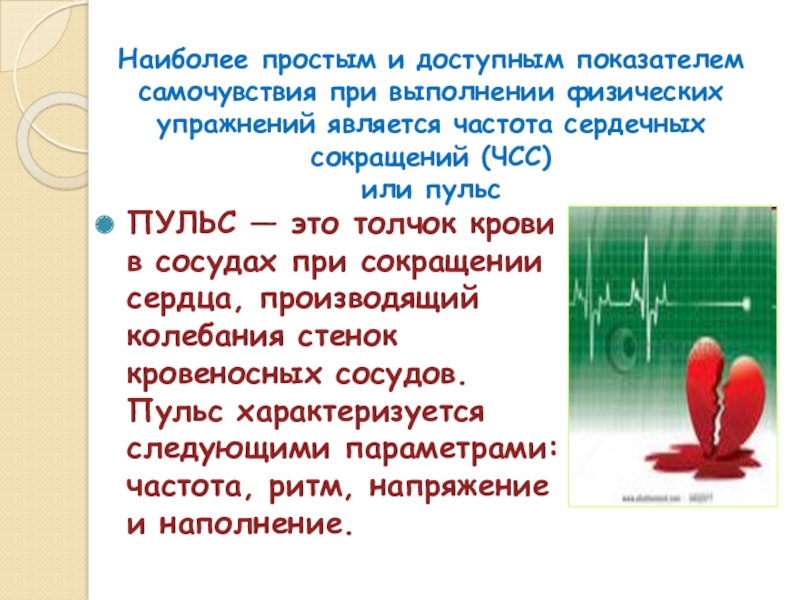 ПУЛЬС — это толчок крови в сосудах при сокращении сердца, производящий колебания стенок кровеносных сосудов. Пульс характеризуется следующими параметрами: частота, ритм, напряжение и наполнение.