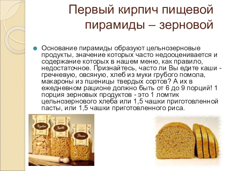 Слайд 8Первый кирпич пищевой пирамиды – зерновой