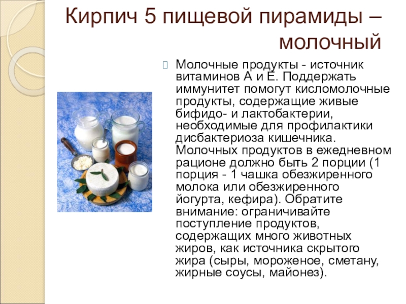 Слайд 12Кирпич 5 пищевой пирамиды – молочный