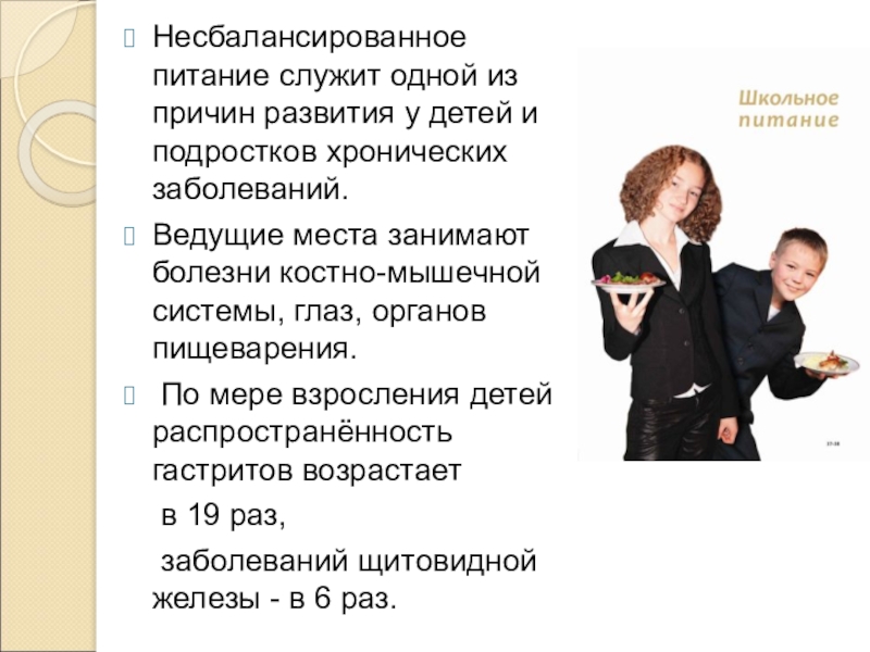 Слайд 6Несбалансированное питание служит одной из причин развития у детей и подростков