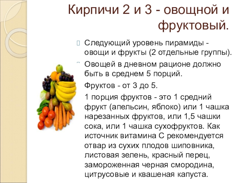 1 порция фруктов - это 1 средний фрукт (апельсин, яблоко) или 1 чашка нарезанных фруктов, или 1,5 чашки сока, или 1 чашка сухофруктов. Как источник витамина С рекомендуется отвар из сухих плодов шиповника, листовая зелень, красный перец, замороженная черная смородина, цитрусовые и квашеная капуста.