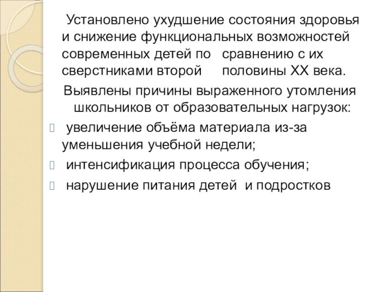 Слайд 3 Установлено ухудшение состояния здоровья и снижение функциональных возможностей современных детей по