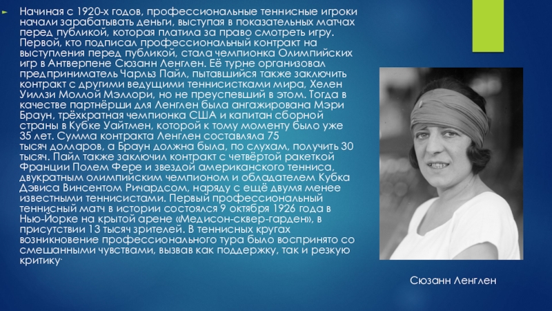 в показательных матчах перед публикой, которая платила за право смотреть игру. Первой, кто подписал профессиональный контракт на выступления перед публикой, стала чемпионка Олимпийских игр в Антверпене Сюзанн Ленглен. Её турне организовал предприниматель Чарльз Пайл, пытавшийся также заключить контракт с другими ведущими теннисистками мира, Хелен Уиллзи Моллой Мэллори, но не преуспевший в этом. Тогда в качестве партнёрши для Ленглен была ангажирована Мэри Браун, трёхкратная чемпионка США и капитан сборной страны в Кубке Уайтмен, которой к тому моменту было уже 35 лет. Сумма контракта Ленглен составляла 75 тысяч долларов, а Браун должна была, по слухам, получить 30 тысяч. Пайл также заключил контракт с четвёртой ракеткой Франции Полем Фере и звездой американского тенниса, двукратным олимпийским чемпионом и обладателем Кубка Дэвиса Винсентом Ричардсом, наряду с ещё двумя менее известными теннисистами. Первый профессиональный теннисный матч в истории состоялся 9 октября 1926 года в Нью-Йорке на крытой арене «Медисон-сквер-гарден», в присутствии 13 тысяч зрителей. В теннисных кругах возникновение профессионального тура было воспринято со смешанными чувствами, вызвав как поддержку, так и резкую критику.