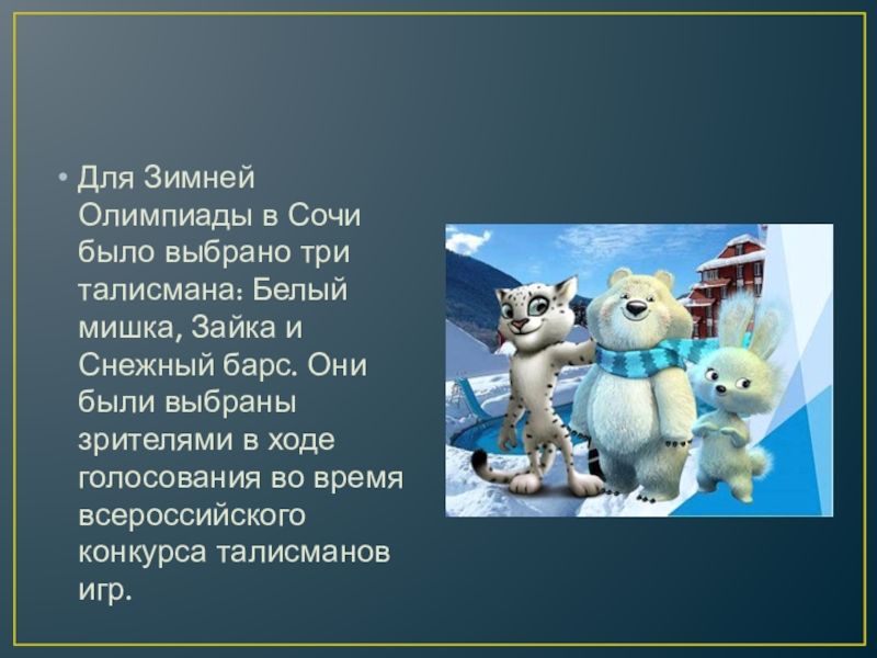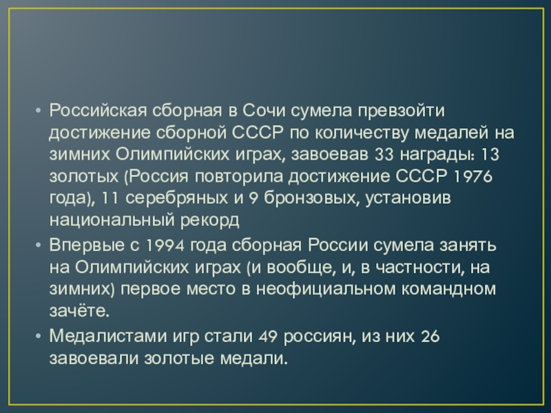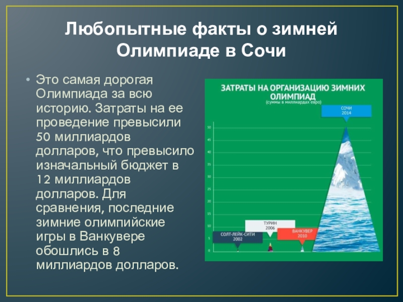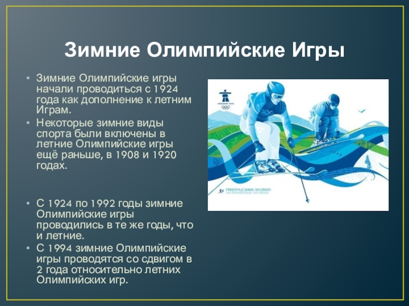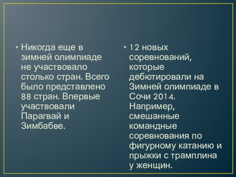 12 новых соревнований, которые дебютировали на Зимней олимпиаде в Сочи 2014. Например, смешанные командные соревнования по фигурному катанию и прыжки с трамплина у женщин.