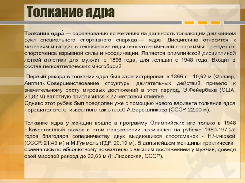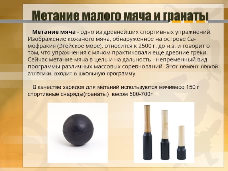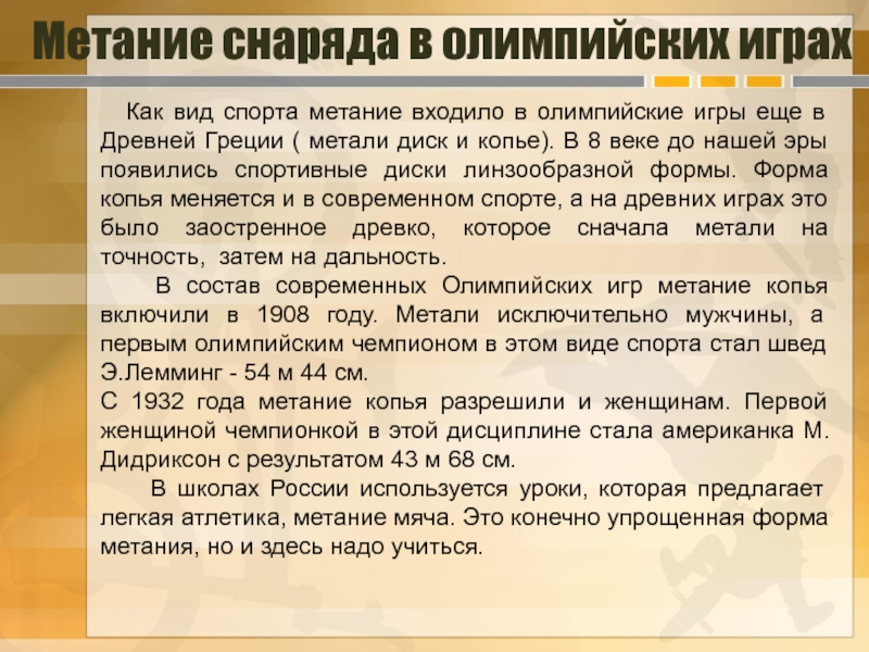 Метание копья (гранаты, малого мяча) – смешанный вид, требующий от занимающегося проявления скоростных и силовых качеств, гибкости и координации. Метание выполняется с прямого разбега, преимущественно на стадионе.