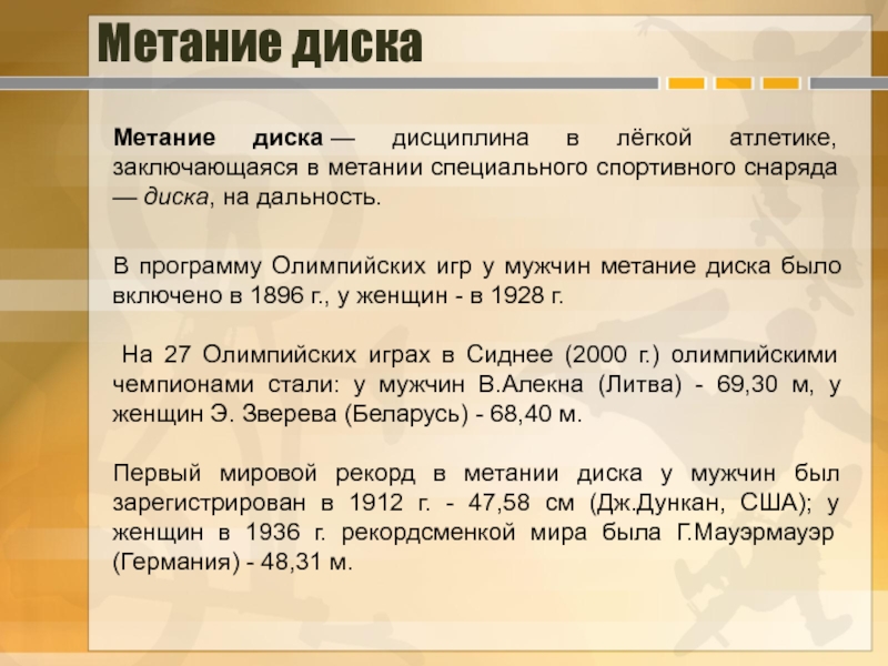 Метание диска — дисциплина в лёгкой атлетике, заключающаяся в метании специального спортивного снаряда — диска, на дальность.