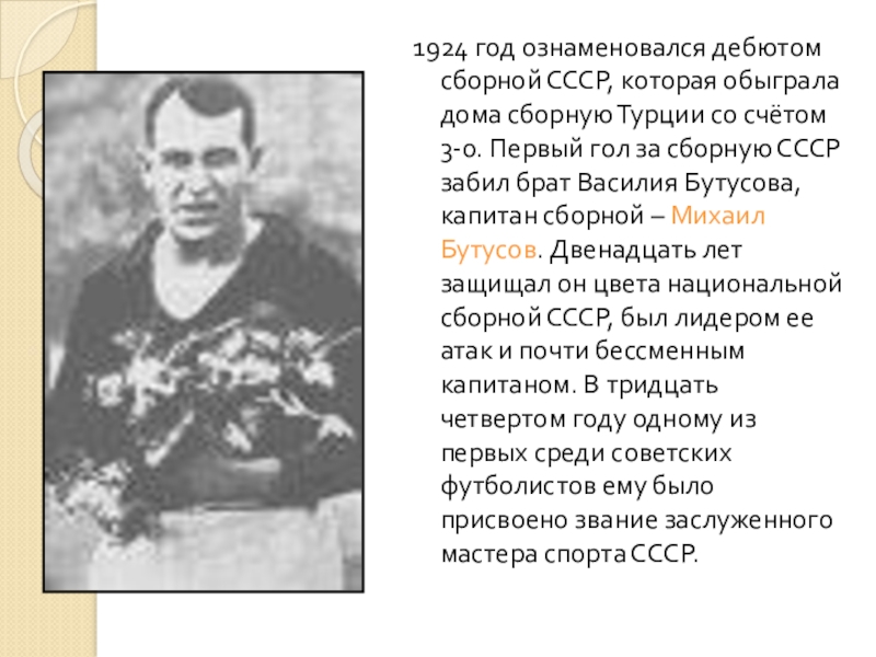 со счётом 3-0. Первый гол за сборную СССР забил брат Василия Бутусова, капитан сборной – Михаил Бутусов. Двенадцать лет защищал он цвета национальной сборной СССР, был лидером ее атак и почти бессменным капитаном. В тридцать четвертом году одному из первых среди советских футболистов ему было присвоено звание заслуженного мастера спорта СССР.