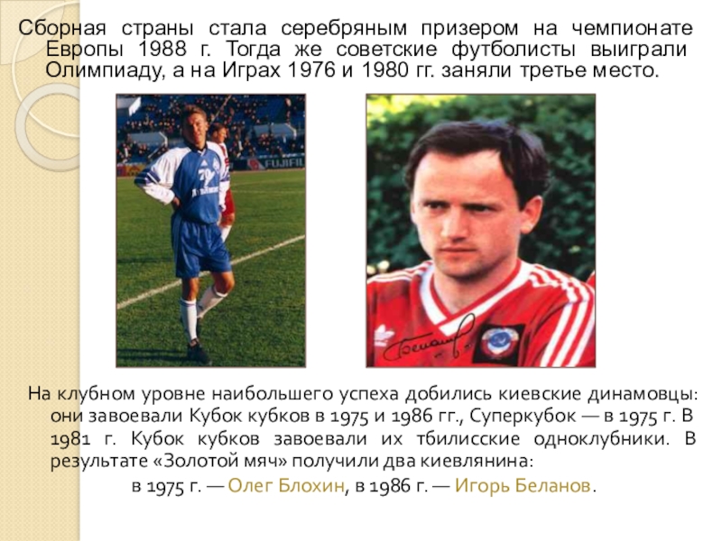 Сборная страны стала серебряным призером на чемпионате Европы 1988 г. Тогда же советские футболисты выиграли Олимпиаду, а на Играх 1976 и 1980 гг. заняли третье место.