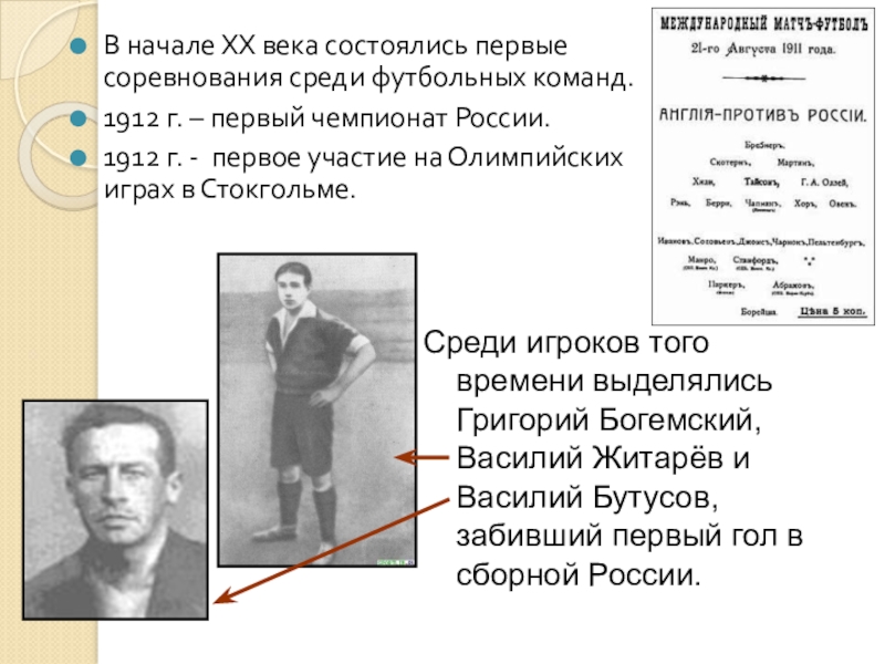 Среди игроков того времени выделялись Григорий Богемский, Василий Житарёв и Василий Бутусов, забивший первый гол в сборной России.