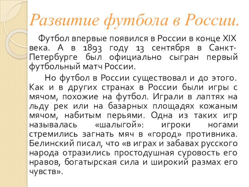 России в конце XIX века. А в 1893 году 13 сентября в Санкт-Петербурге был официально сыгран первый футбольный матч России.