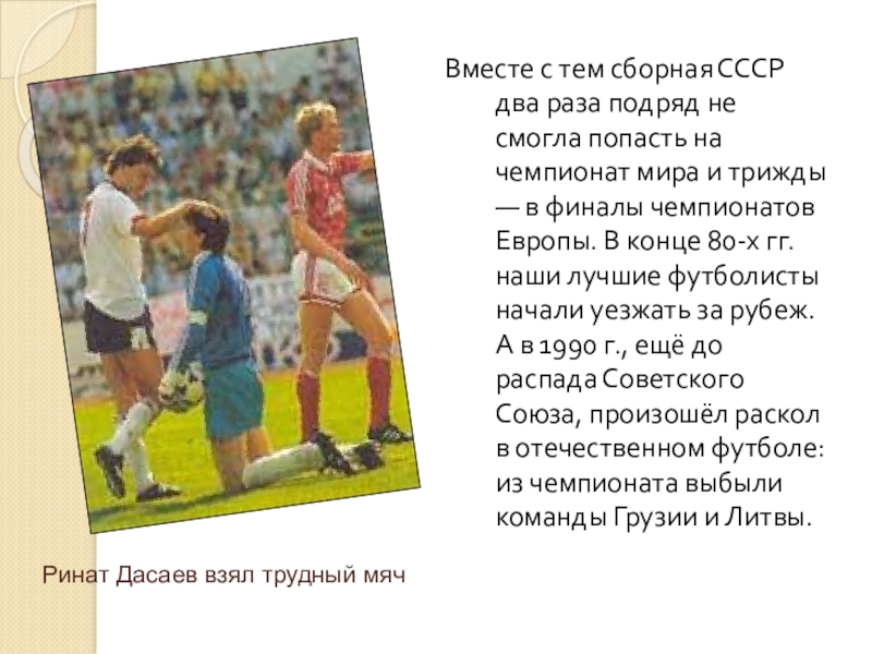 на чемпионат мира и трижды — в финалы чемпионатов Европы. В конце 80-х гг. наши лучшие футболисты начали уезжать за рубеж. А в 1990 г., ещё до распада Советского Союза, произошёл раскол в отечественном футболе: из чемпионата выбыли команды Грузии и Литвы.