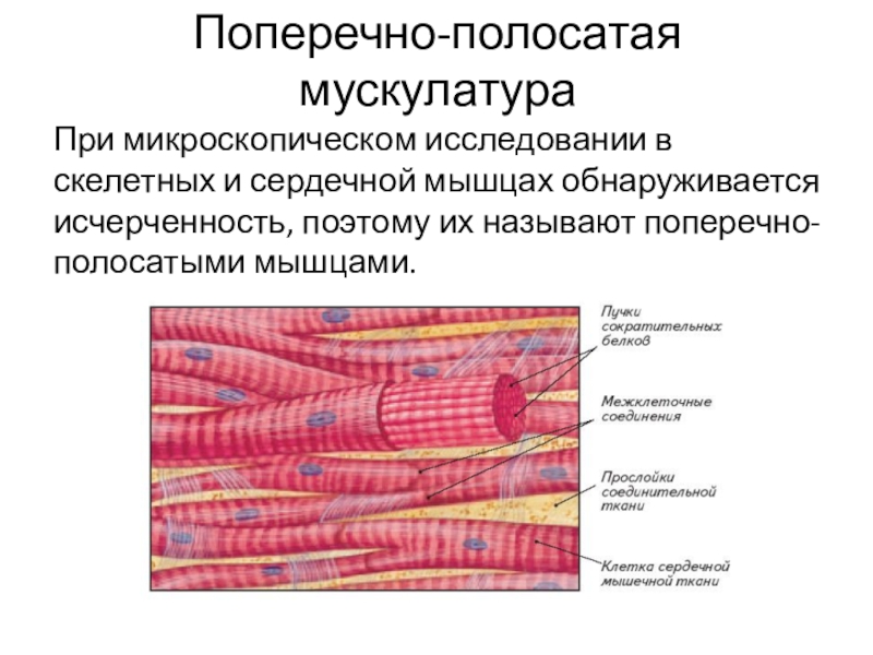 При микроскопическом исследовании в скелетных и сердечной мышцах обнаруживается исчерченность,
