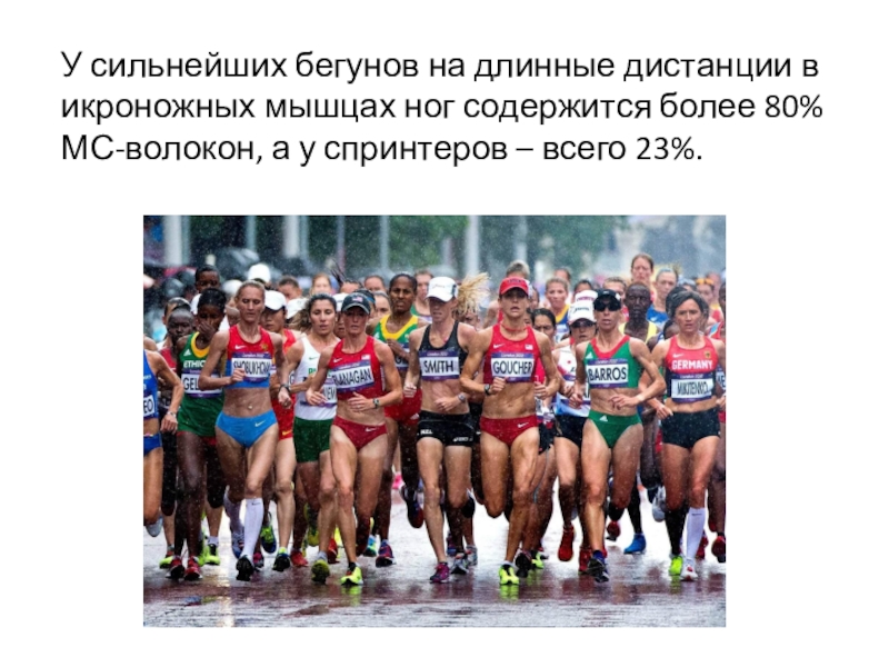 Слайд 14У сильнейших бегунов на длинные дистанции в икроножных мышцах ног содержится